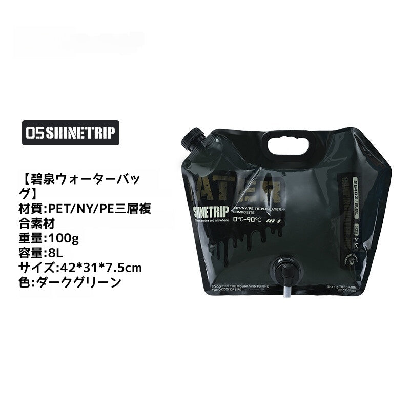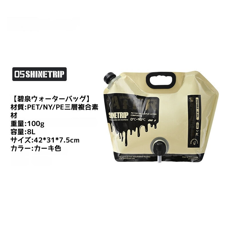 飲料水や生活用水など、さまざまな液体を収納可能。キャンプ・登山・車中泊などのアウトドア活動で、これ一つで給水ニーズを解決します。